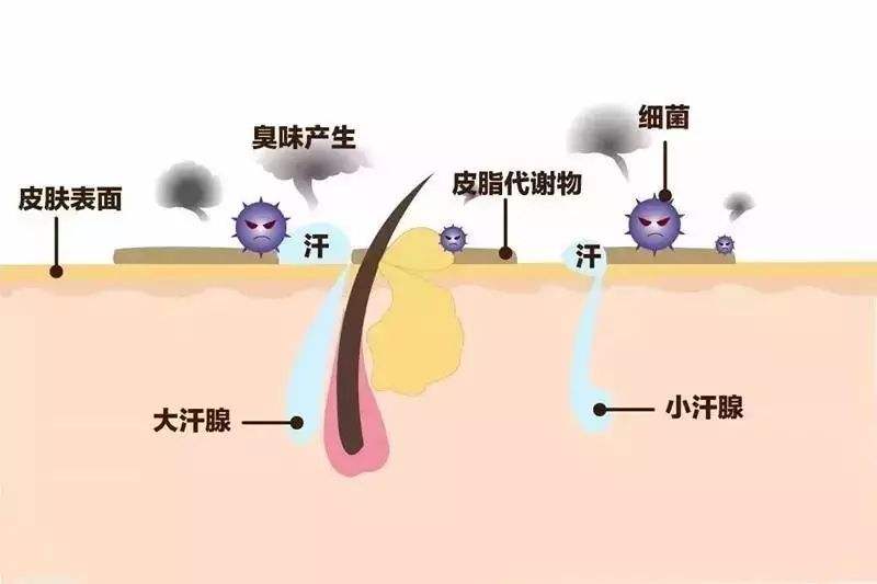 1、顶泌汗腺性臭汗症:顶泌汗腺只存在于腋窝、乳晕、脐窝、肛门、外阴和外耳道等部位,除腋窝外,该腺体在其他部位的功能极弱产生的汗液极少。顶泌汗腺分泌的汗液初始是无菌的,在微生物的作用下,分解汗液中的有机物,形成具有特殊臭味的短链脂肪酸和氨,导致了顶泌汗腺性臭汗症的发生。